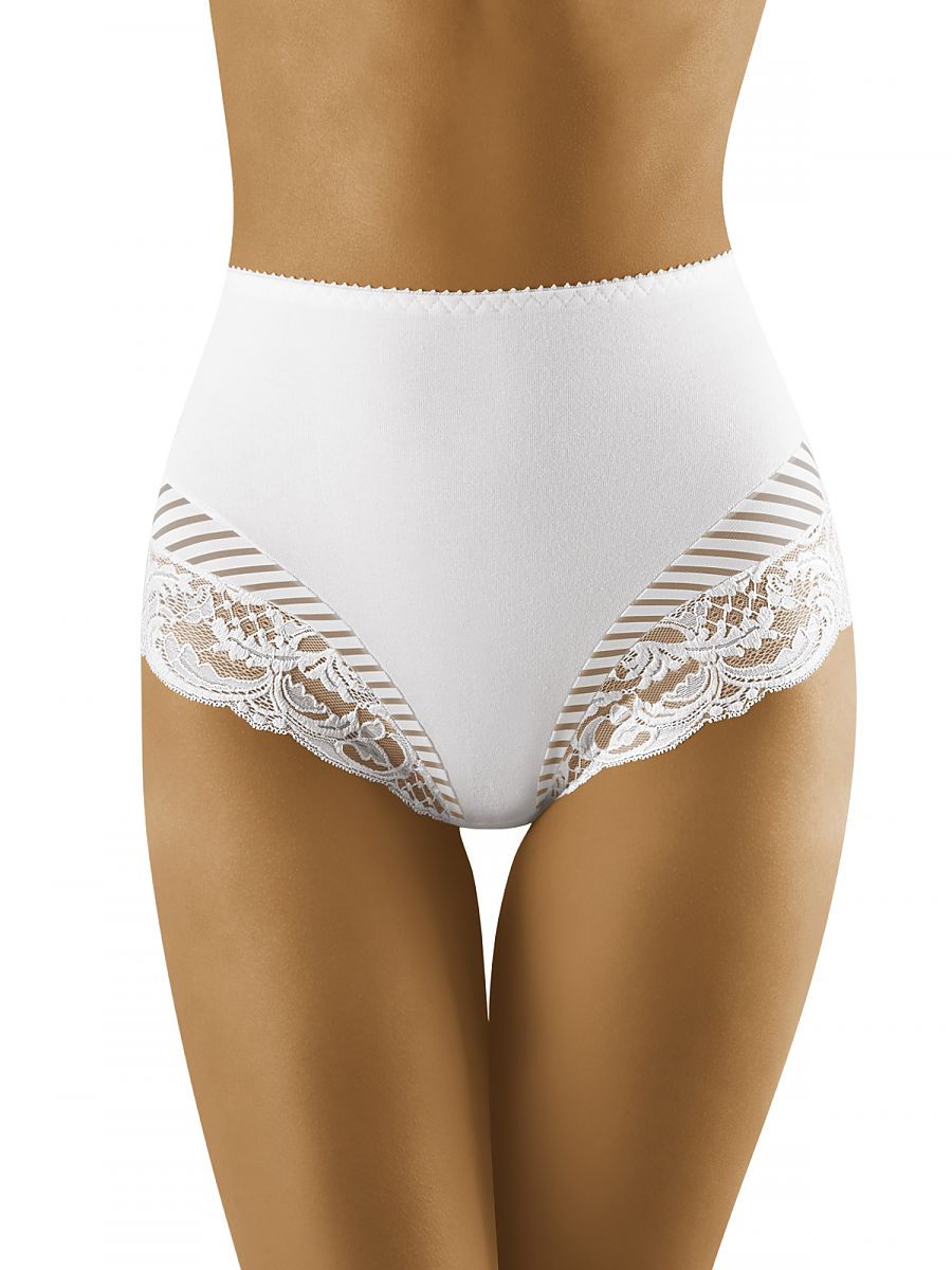Algodón braguitas con un higher cut, decorado con encaje at el thighs y un interesting, transparente striped tul. These two patterns combined con cómodo, smooth fabric create un original arrangement, thanks to que el caderas look elegante y shapely. El cut gently shapes el tummy.