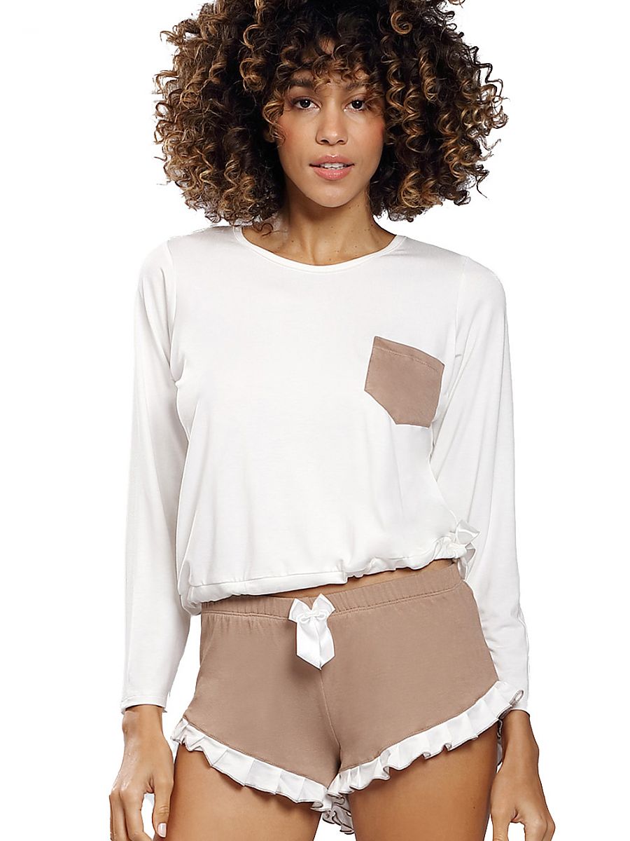 El viscose conjunto Ronnie consists de un light-colored long-sleeve blouse con un brown pocket y shorts trimmed con un frill. El whole conjunto looks delica...