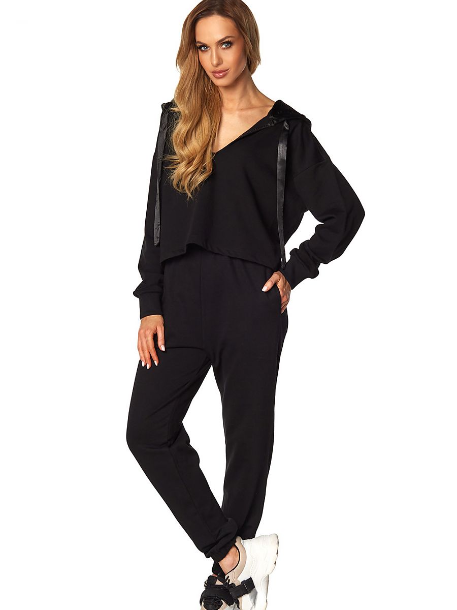 Great, two-piece conjunto hecho de alta calidad algodón, que quickly become tu favorite item en tu wardrobe. Suave y highly cómodo, polished up en cada detail, y también incredibly femenino. El top es un long-sleeved blouse con un hood forrado con hermoso plateado satén. V escote temptingly exposes charms. Long pants con side pockets, legs finished con elastic band. Clásico negro.