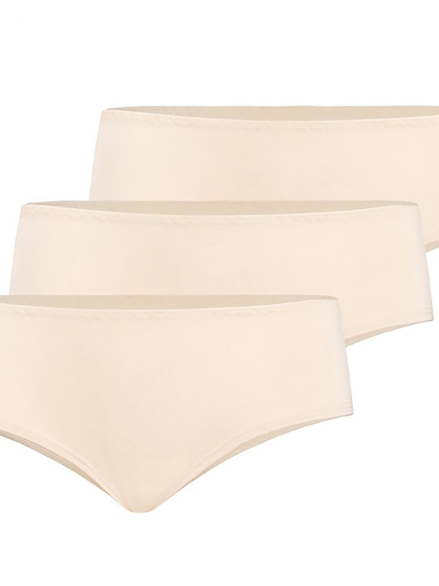 Un 3-pack de mujer's bamboo brasiliana braguitas en beige. El sets son packaged en packs de three y son highly regarded en el lenceríun market.