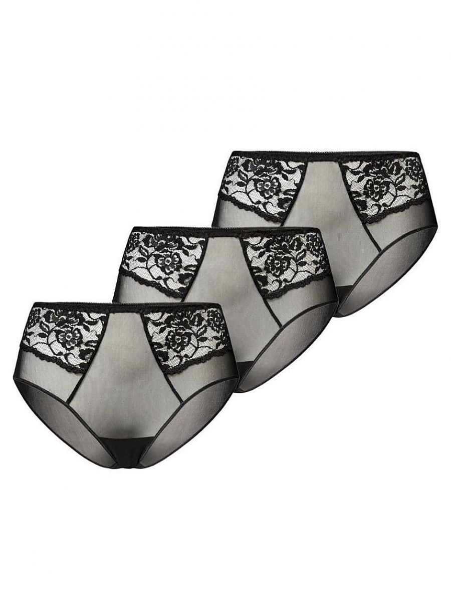Un trio de alto-waisted Vida mujer's braguitas en negro. They son hecho de alto-calidad delicado, airy y transparente malla, que tempts el eye y works en el...