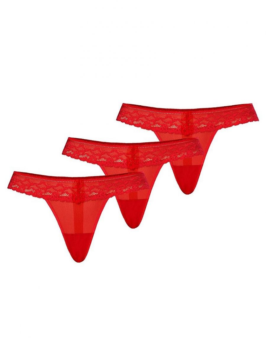 Un conjunto de mujer's tangas, sexy y tentador to el male eye, en juicy rojo. Tripacks de rojo tangas son often purchased by men para their chosen ones en such occasions as Valentine's Day. El tanga en el multi-pack es hecho de striking, delicado malla con el addition de elastic encaje, que wraps around el caderas.