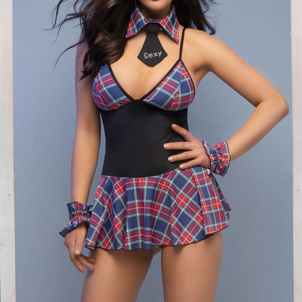 Disfraz de colegiala (5 piezas)El conjunto se compone de:- corbata- cuello- un minivestido- bragas a cuadros- puñosProducto de alta calidad embalado en una eleg