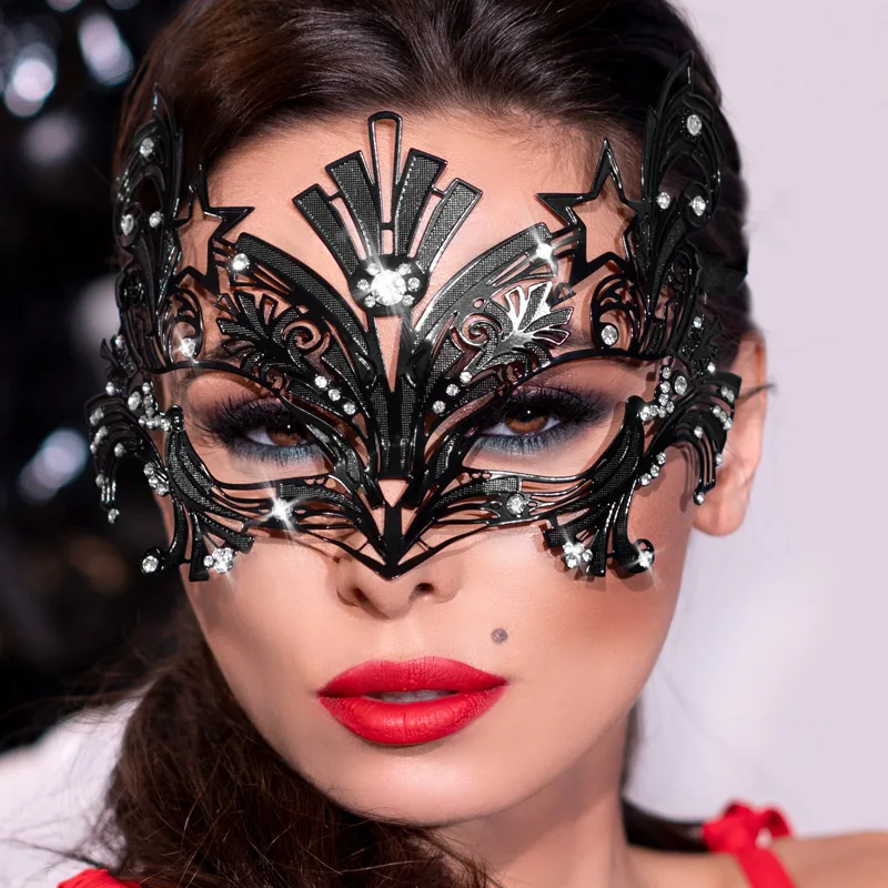 Máscara de filigrana de metal negro, anatómica y flexible, realzada por numerosos diamantes de imitación. Ata por detrás con cintas de raso negro.