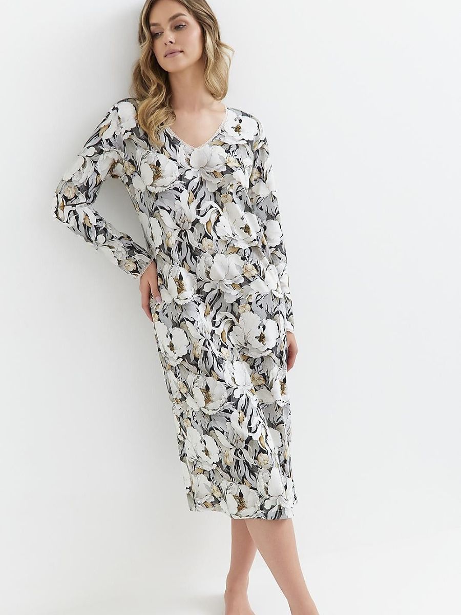 Mujer's nightshirt es un elegante proposition para un peaceful sleep. Hecho de suave fabric con un estampado, ello ensures comodidad y pleasure de wearing throughout el night. V-escote, finished con delicado encaje, adds un subtle charm. Knee-length y loose, cómodo cut guarantee freedom de movement, y long sleeves, también finished con encaje, enfatiza its elegante character. El whole es packed en un practical plastic bag, que makes el nightshirt perfecto para un gift.