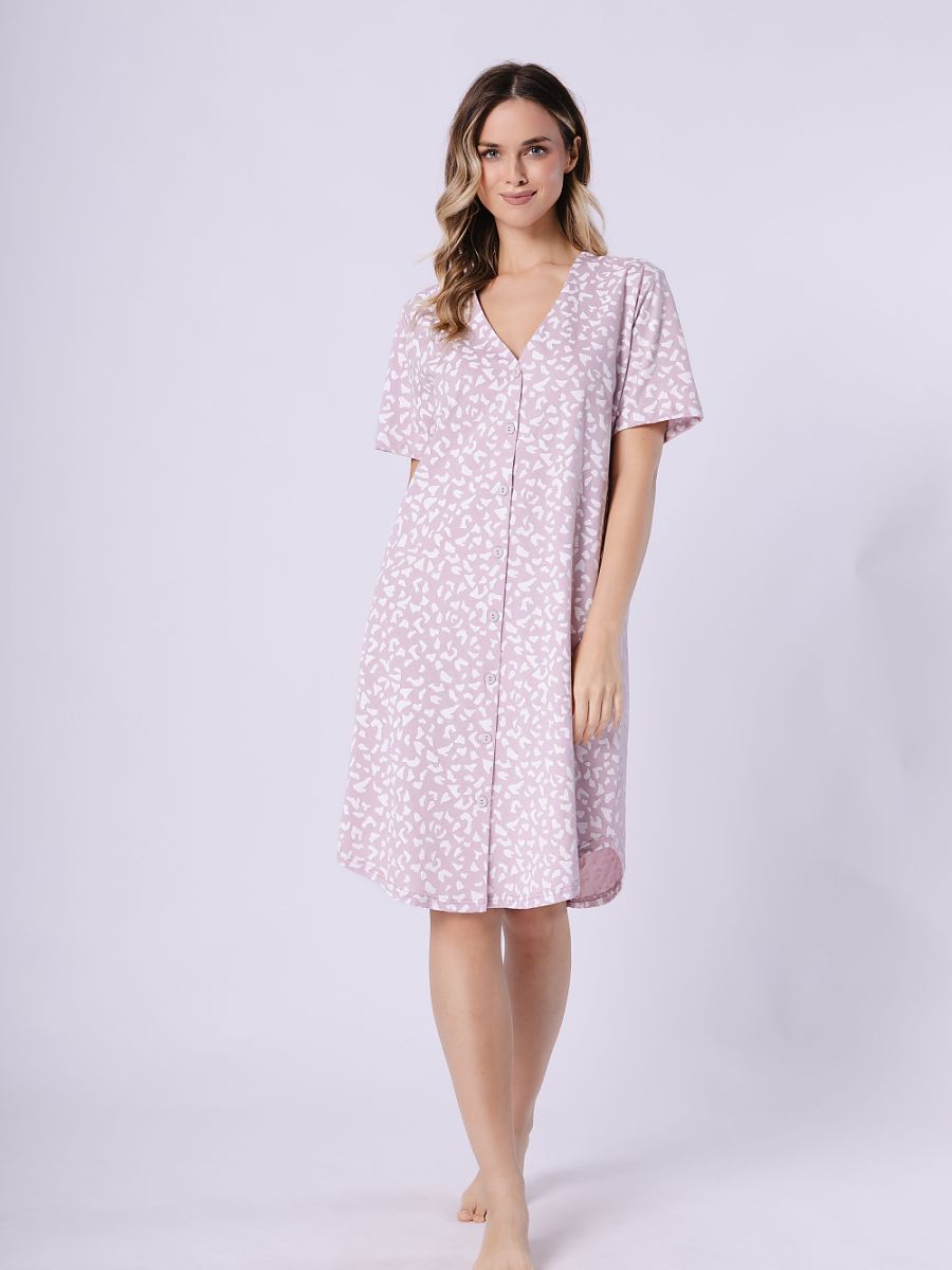 Este camisón combines comodidad con subtle, clásico style. Loose, cómodo cut y suave, breathable fabric con un estampado ensure full freedom de movement y comodidad throughout el night. El modelo reaches to el knees, tiene short sleeves y un semi-circular bottom, que adds lightness y un femenino character to ello. El camisón es buttoned up all el way, y el subdued color scheme gives ello un elegante, calm look. El whole conjunto es packed en un practical plastic bag, perfecto también as un gift.