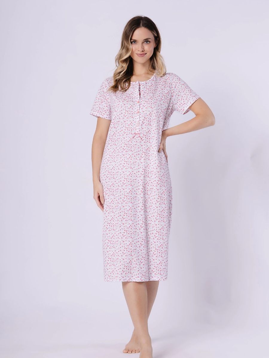 Este nightshirt was designed con maximum comodidad en mind. El round escote y loose, cómodo cut provide freedom de movement y comodidad during sleep. El knee-length modelo es hecho de suave y breathable fabric con un estampado ese pleasantly envelops el body. El short sleeve makes el nightshirt perfecto para warmer nights. Button cierre halfway down adds functionality y un clásico character. El whole conjunto es packed en un practical plastic bag, perfecto para un gift.