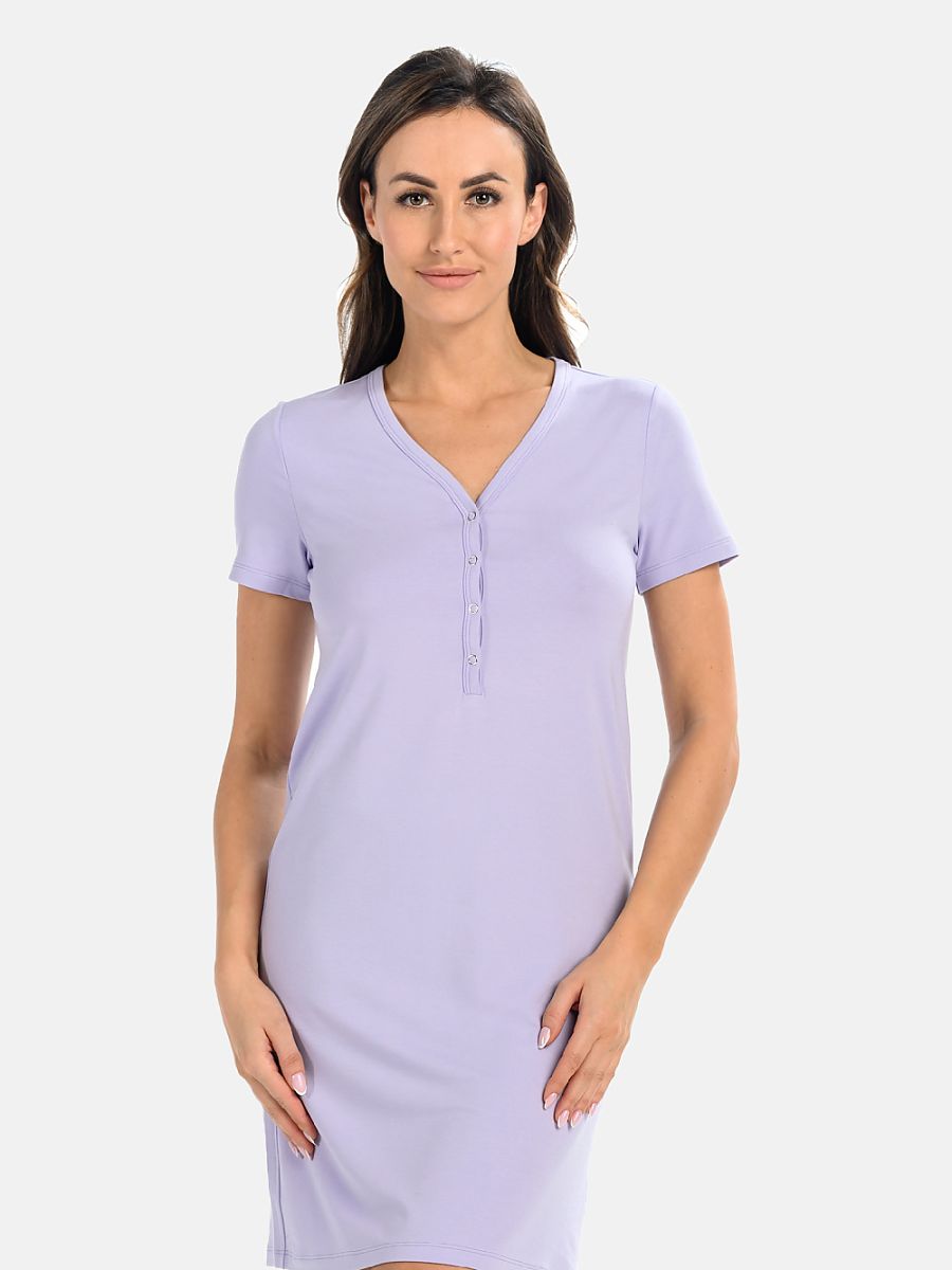Mujer's nursing nightshirt hecho de delicado y pleasant to el touch viscose, que cools el body. El addition de elastic Lycra thread guarantees longer use y perfecto ajuste to el silueta. El mujer's nightshirt es en un hermoso y moderno lavender color. Ello tiene short sleeves. At el front, ello es abrochado con small snaps, que makes ello cómodo to use when nursing un child. El unbuttoned escote es un alternative to nursing shirts. En length, el nightshirt reaches solo above el knee, gently fitting el silueta. Ello tiene un simple clásico cut. Ello should no be missing en cada mujer's wardrobe.