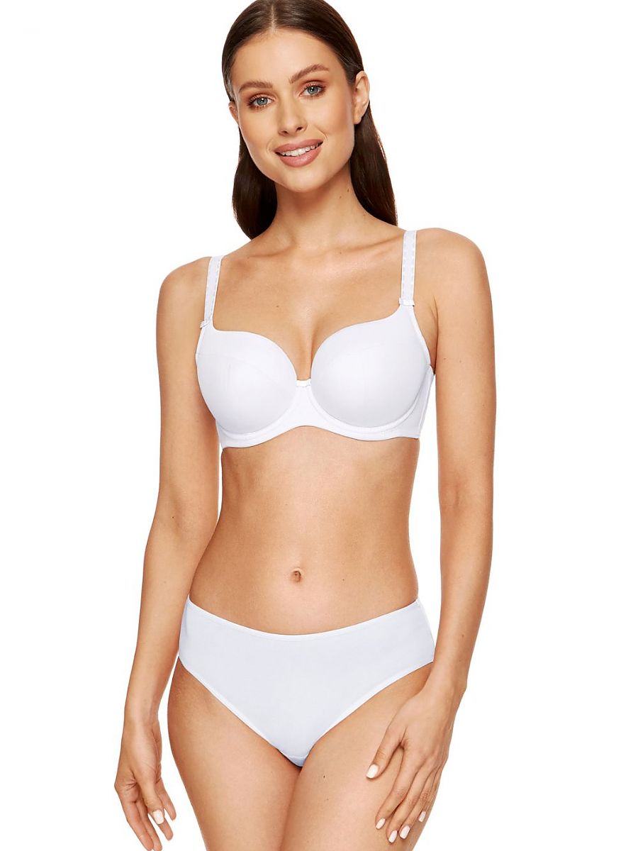 Clásico sujetador en un universal color ese es un perfecto complementa to cualquier lenceríun. Stiffened bowls, hecho de corsetry foam trimmed con smooth knit fabric. El inner part de el cups es covered con OEKO-TEX-standard algodón, making them piel-friendly. Vertical side whalebones stabilize el sujetador's circumference. El sujetador es decorado con small lazos placed entre el cups y en el tirantes. El sujetador was designed y sewn en Poland.