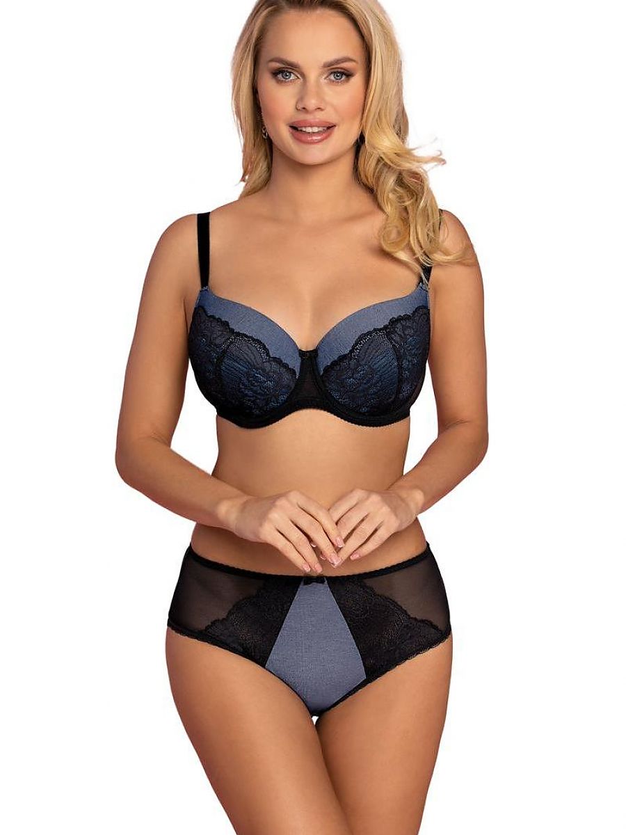 Elegante con relleno sujetador. El upper part de el cup es hecho de fabric imitating denim, el lower part de el cups es covered con encaje. No vertical side whalebones. Un lazo entre el cups, ajustable, non-removable tirantes. Espalda hecho de malla, gancho-y-loop fastening.