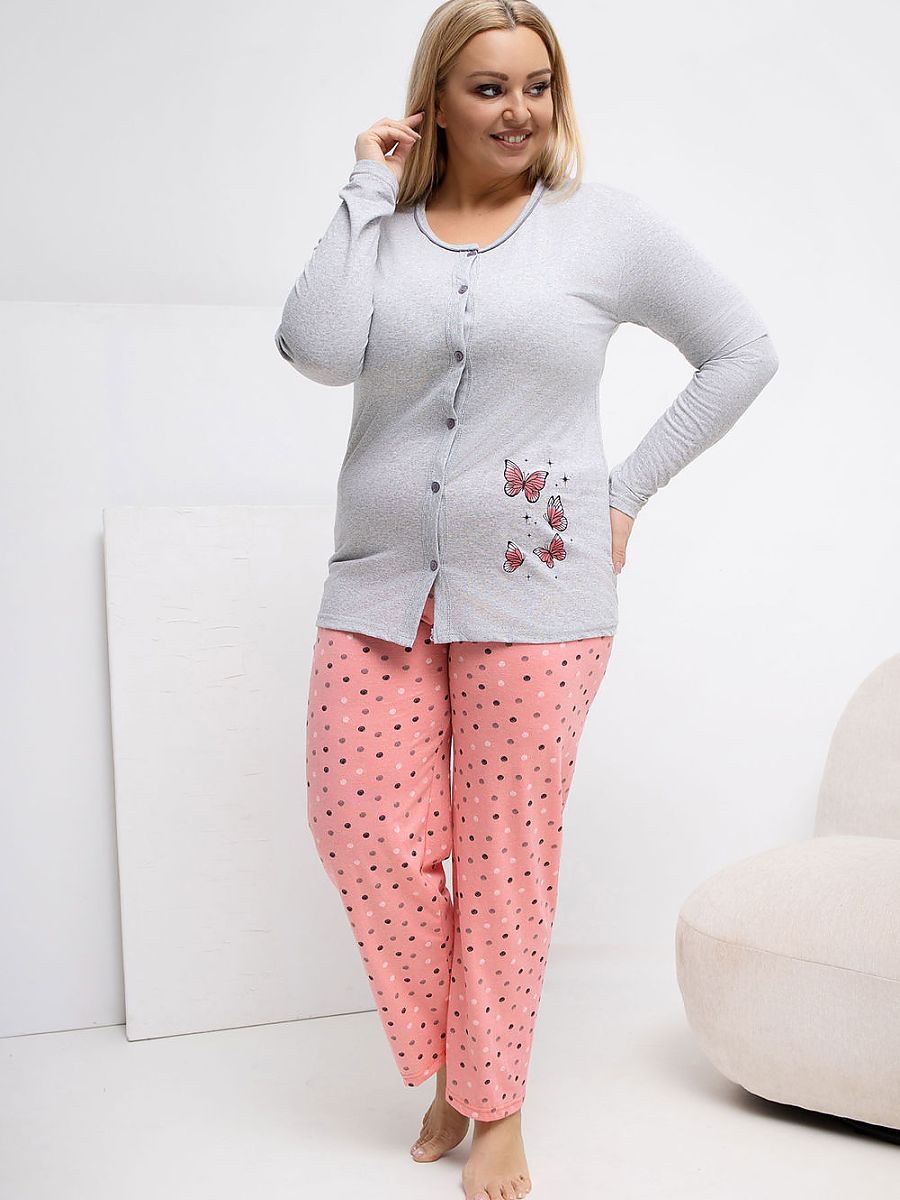 Cómodo plus talla mujer's pajamas, consisting de un top y pants, combining comodidad con un encantador, femenino style. El butterfly estampado en el top adds lightness y subtle elegance, while el clásico round escote ensures un cómodo ajuste. Long sleeves y front button fastening increase wearing comodidad y practicality. El pants con straight legs, featuring un encantador polka dot patrón, complete el look y give el pajamas un harmonious appearance. Made mainly de suave, pleasant to el touch algodón, el pajamas guarantee freedom de movement y comodidad during sleep, while presenting themselves stylishly y femininely.