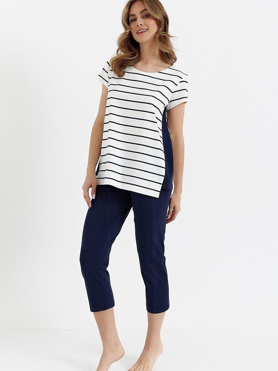 Clásico y cómodo mujer's pajamas, perfecto para warmer nights. El blouse con short sleeves y un round escote provides freedom de movement y comodidad. El simple, timeless diseño es great para sleeping y relaxing at home. El 3/4 length pants sin pockets tiene un elastic waistband para un perfecto ajuste. El conjunto es packed en un practical plastic bag, también perfecto as un gift.