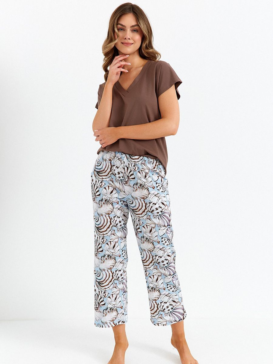 Moderno y cómodo mujer's pajamas designed con diario comodidad en mind. El short-sleeved top con un V-neck subtly enfatiza el female silueta, while el loose ajuste ensures full freedom de movement. El modelo es equipped con practical pockets ese add functionality. Included en el conjunto son 7/8 length pants con un eye-catching estampado. El elastic waistband guarantees un perfecto ajuste y comodidad during llevar. Este es un excellent choice para mujer who appreciate el combinación de style y comodidad.