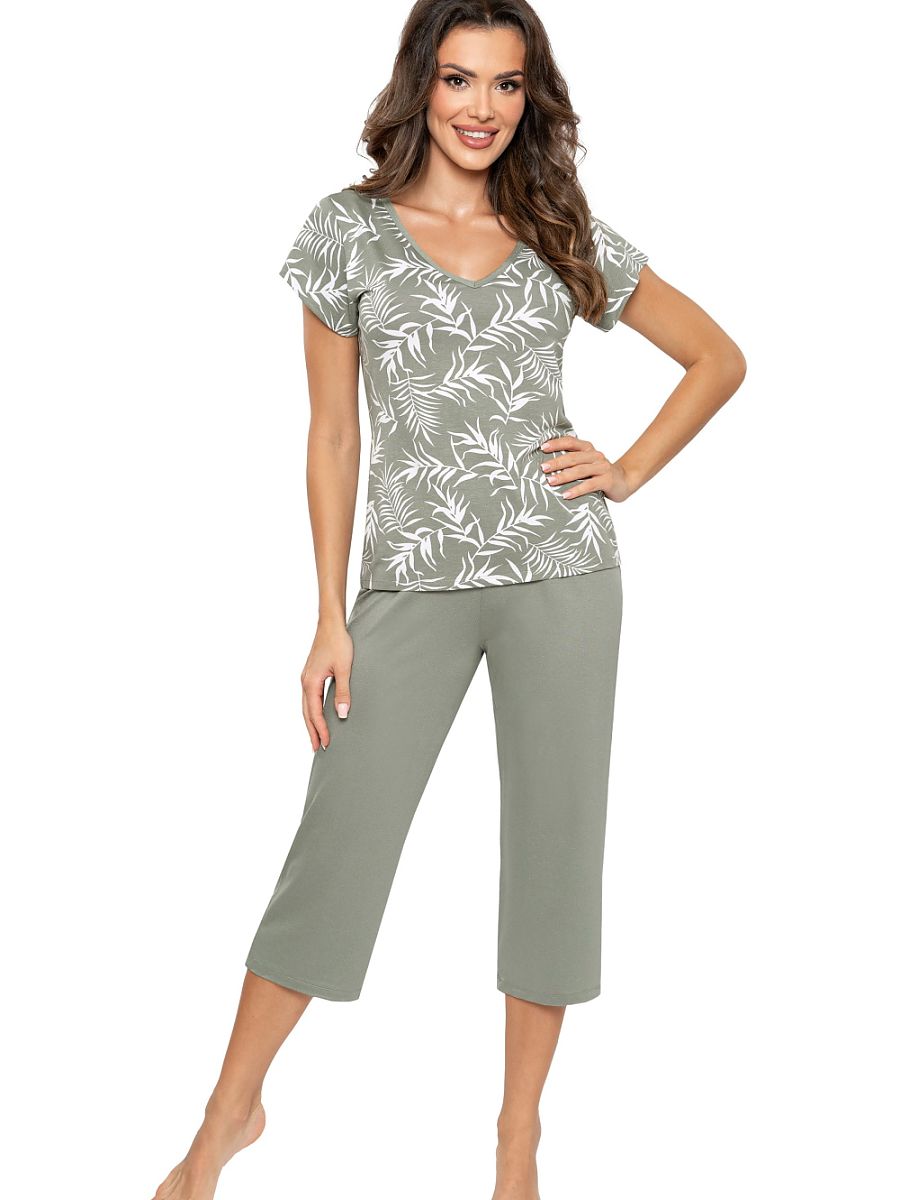 Elegante y cómodo mujer's pajamas made entirely de suave, breathable viscose, proporcionando comodidad y pleasure to llevar. El blouse decorado con un delicado leaf patrón adds subtle charm to el whole. El V-escote y short sleeves guarantee freedom de movement y perfecto ajuste. Smooth olive-colored pants, 3/4 length y loose cut, provide full comodidad y un stylish look. Un ideal proposal para mujer who appreciate el combinación de comodidad y elegance en diario life.