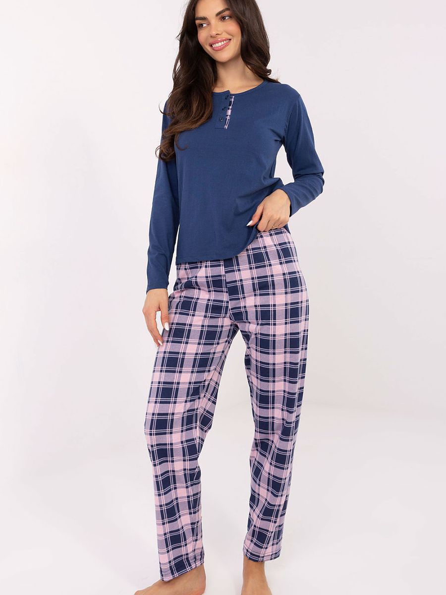 Mujer's pajamas son un cómodo, two-piece conjunto consisting de un blouse y pants. El blouse tiene un round escote, long sleeves, y three buttons en el front, que add un subtle, decorative accent. El pants con long, straight legs stand out con un dominant check patrón, dando el whole un clásico y elegante character. El loose ajuste provides full freedom de movement y comodidad during sleep y relaxation at home. Ello es un ideal proposition para mujer who appreciate comodidad, functional cut, y stylish, timeless diseño.
