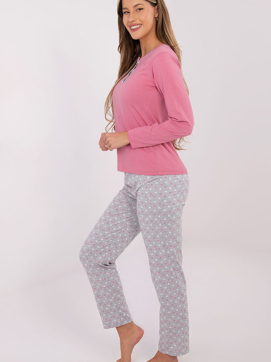 Cómodo, two-piece mujer's pajamas hecho de suave y pleasant to el touch algodón, perfecto para un peaceful sleep y home relaxation. El conjunto consists de un long-sleeved shirt y long pants con straight legs. El shirt es equipped con un round escote y three decorative buttons en el front, que add un subtle charm to ello. El pants son adornado con un dominant estampado, dando el conjunto lightness y un femenino character. El pajamas combinar comodidad, simplicity, y delicado details, making ello perfecto para cada night.