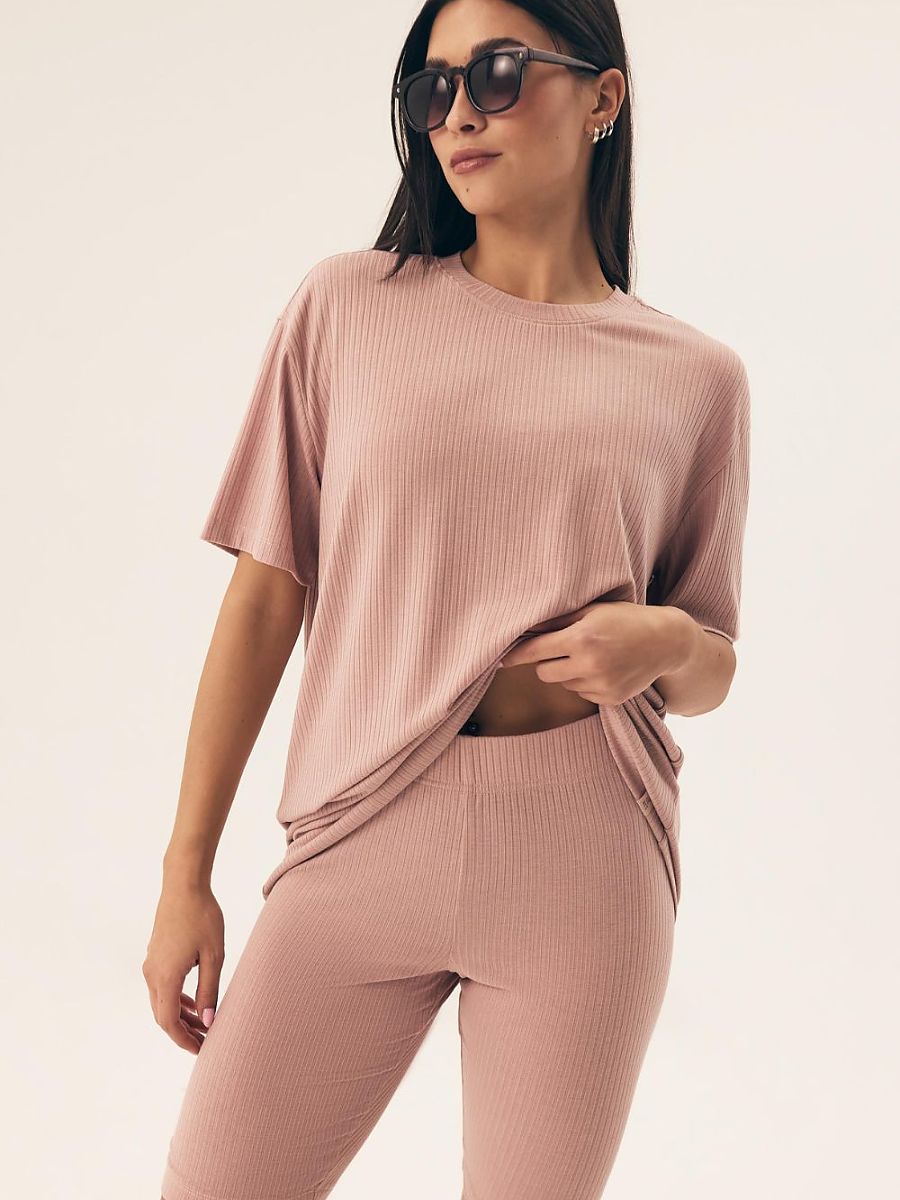 Cómodo y stylish mujer's pajamas, perfecto para ambos sleeping y as cómodo homewear. Hecho de suave, breathable fabric con un ribbed structure, ello provides full freedom de movement y excellent body ajuste. El top de el pajamas tiene un loose ajuste y un rounded escote, so ello fits nicely en el silueta y does no restrict movement. Legging-type shorts, reaching solo above el knee, tiene un wide elastic waistband, ensuring un cómodo y stable ajuste. El conjunto work perfectamente no solo as pajamas, but también as un home conjuntos para lazy mornings o relaxing evenings. El whole conjunto es packed en un practical plastic bag.