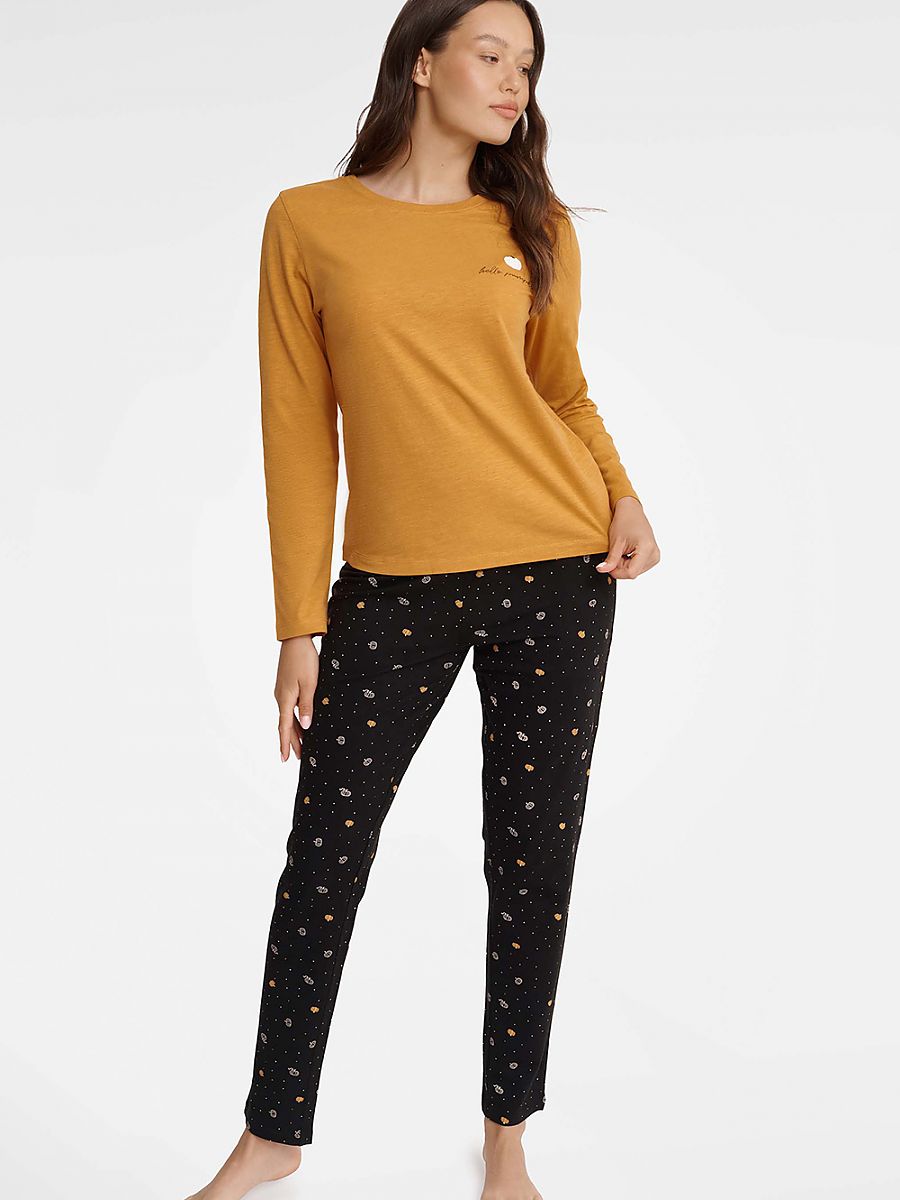 Mujer's two-piece pajamas es un conjunto ese allow tú to combinar fashion y comodidad. El upper part de el conjunto es un mustard blouse con long sleeves.