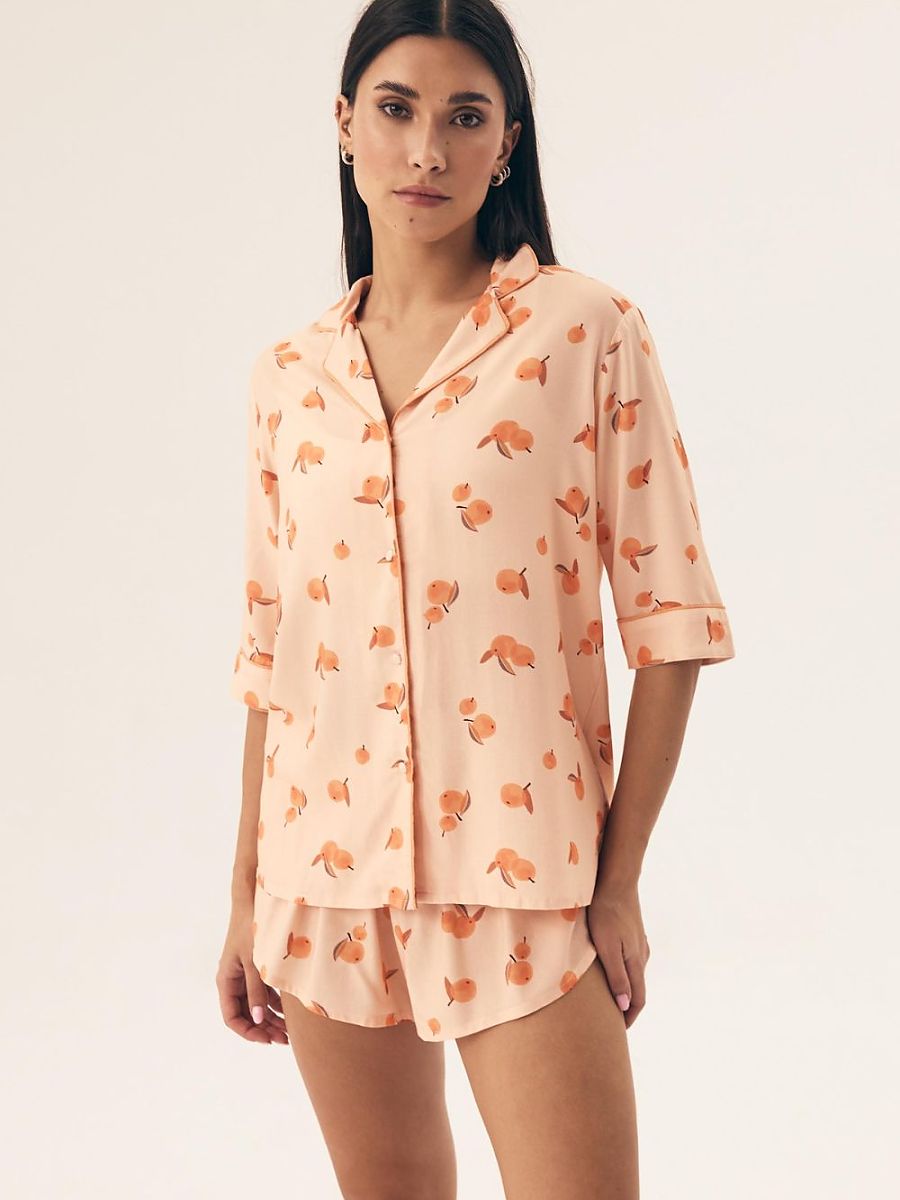Elegante mujer's pajamas con subtle piping details ese combinar style con comodidad. El short-sleeved blouse, buttoned, finished con un collar, creates un c...