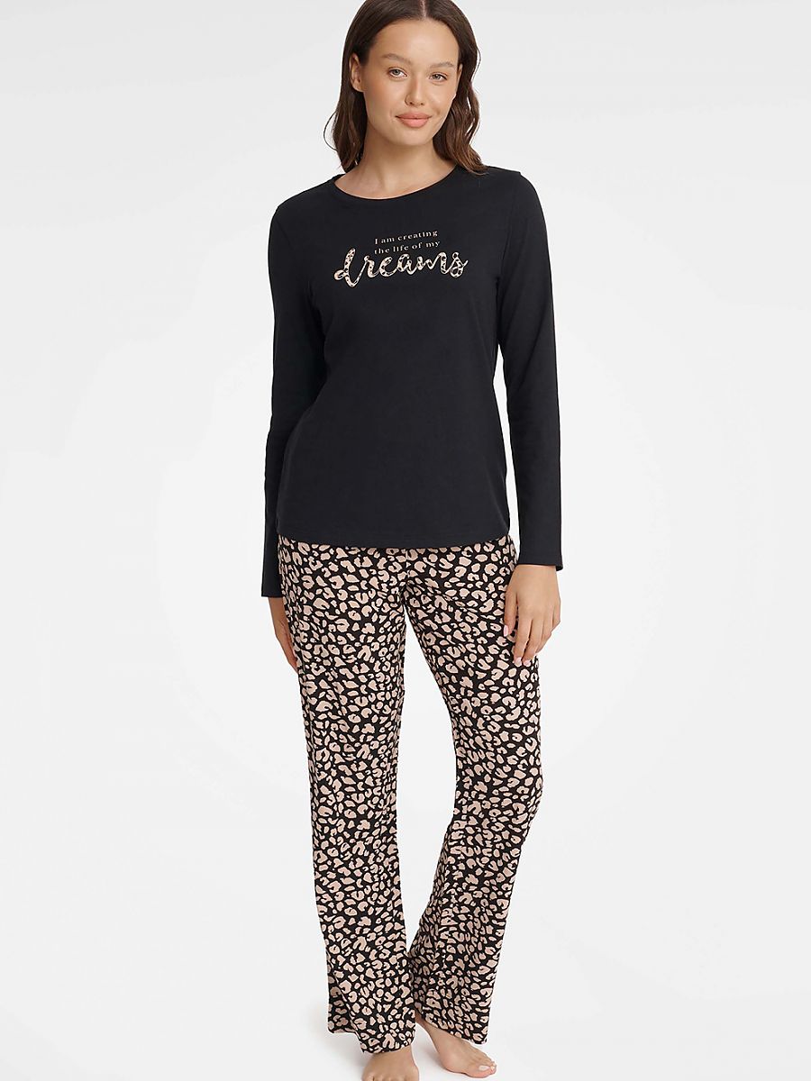 Mujer's two-piece pajamas es un conjunto ese allow tú to combinar fashion y comodidad. El upper part de el conjunto es un negro blouse con long sleeves y un half-round escote. Ahí es un inscription en el front. El lower part de el conjunto es pants con loose legs y un elastic waistband.