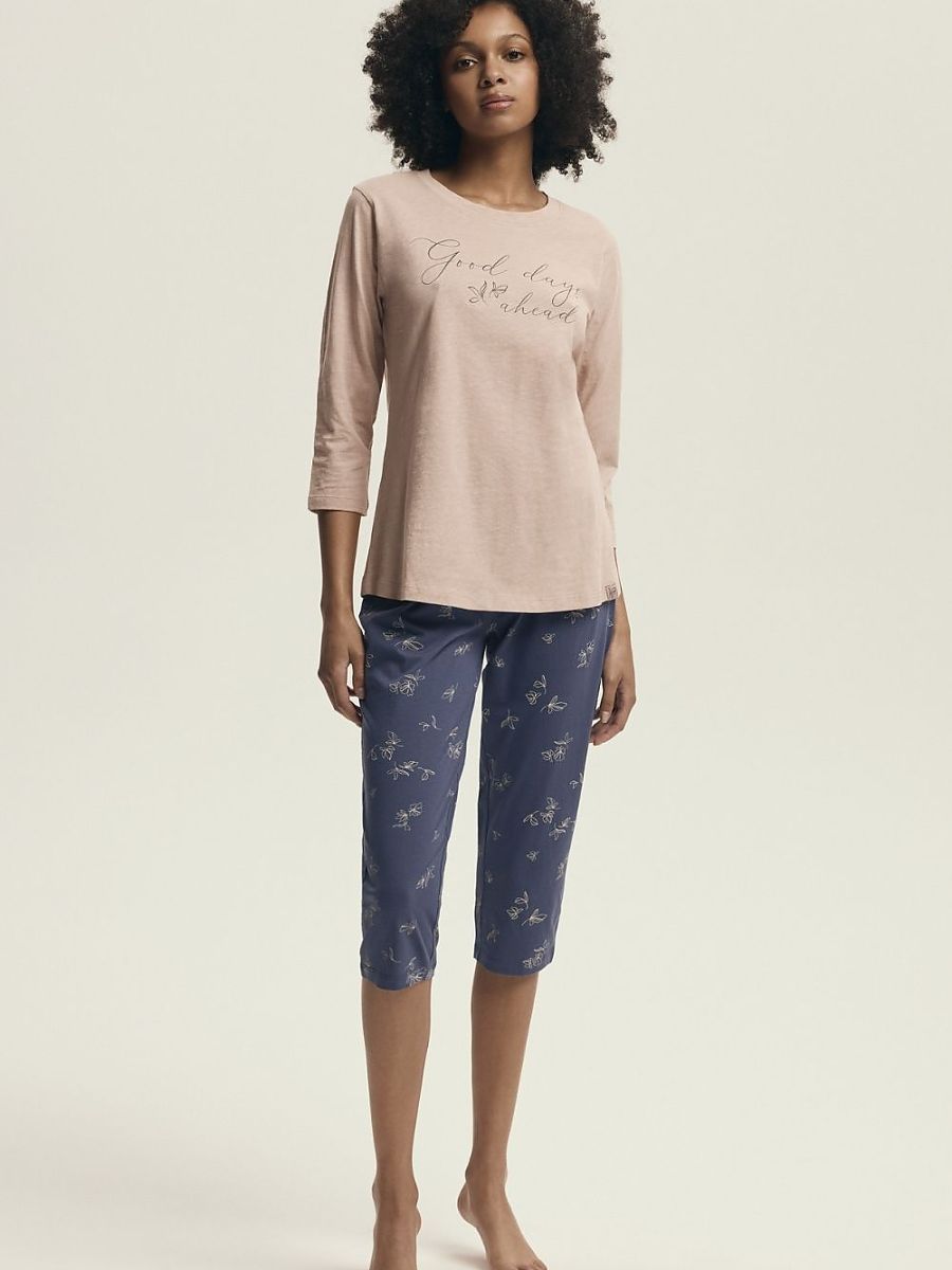 Mujer's pajamas hecho de suave, breathable fabric, guaranteeing comodidad y convenience during sleep. El top con un round escote y un estampado en el front tiene 3/4 length sleeves, making ello perfecto para warmer nights. 3/4 type pants con un moderno estampado y un wide, elastic waistband ensure un perfecto ajuste y freedom de movement. El conjunto es packed en un practical plastic bag, un ideal choice para mujer who appreciate comodidad combined con femenino style.