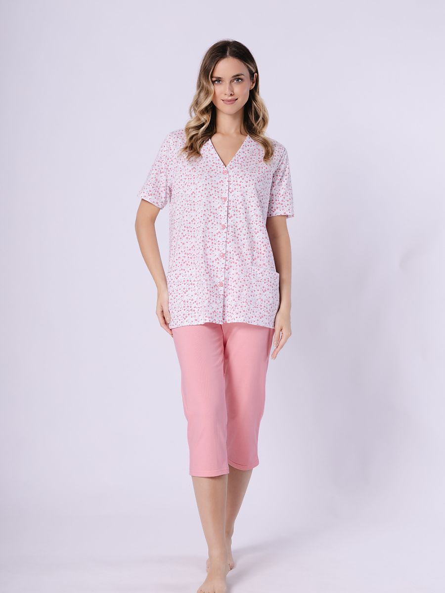 Este stylish mujer's pajama combines comodidad con functionality. El short-sleeved shirt con un loose ajuste es decorado con un un la moda estampado, y practical pockets en el sides add to its diario comodidad. El 3/4 length pants con un elastic waistband provide freedom de movement. Additionally, el shirt con buttons allows para quick y easy adjustment. El conjunto es packed en un plastic bag, making el pajamas un ideal choice para un gift.