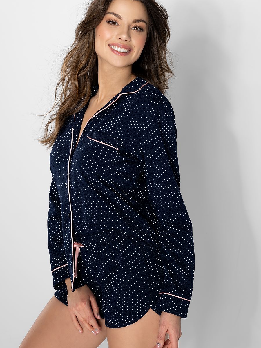 Elegante y stylish two-piece mujer's pajamas hecho de extremely suave, refined algodón. Ello instantly endow tú con extraordinary softness y delicado touch, as well as un hermoso, femenino, clásico look. El azul marino colouring es complemented con small, blanco dots y accesorios en el color de subtle, light rosa. Long sleeves, perfecto para un colder season, finished con satén trimmings. Un pocket en el chest. Un escote con un elegante collar, un button cierre en el middle. El conjunto includes shorts whose legs were properly cut at sides thanks to que legs look phenomenal. Un sweet satén lazo at el cintura. Alta calidad. Polish brand Momenti Per Me.