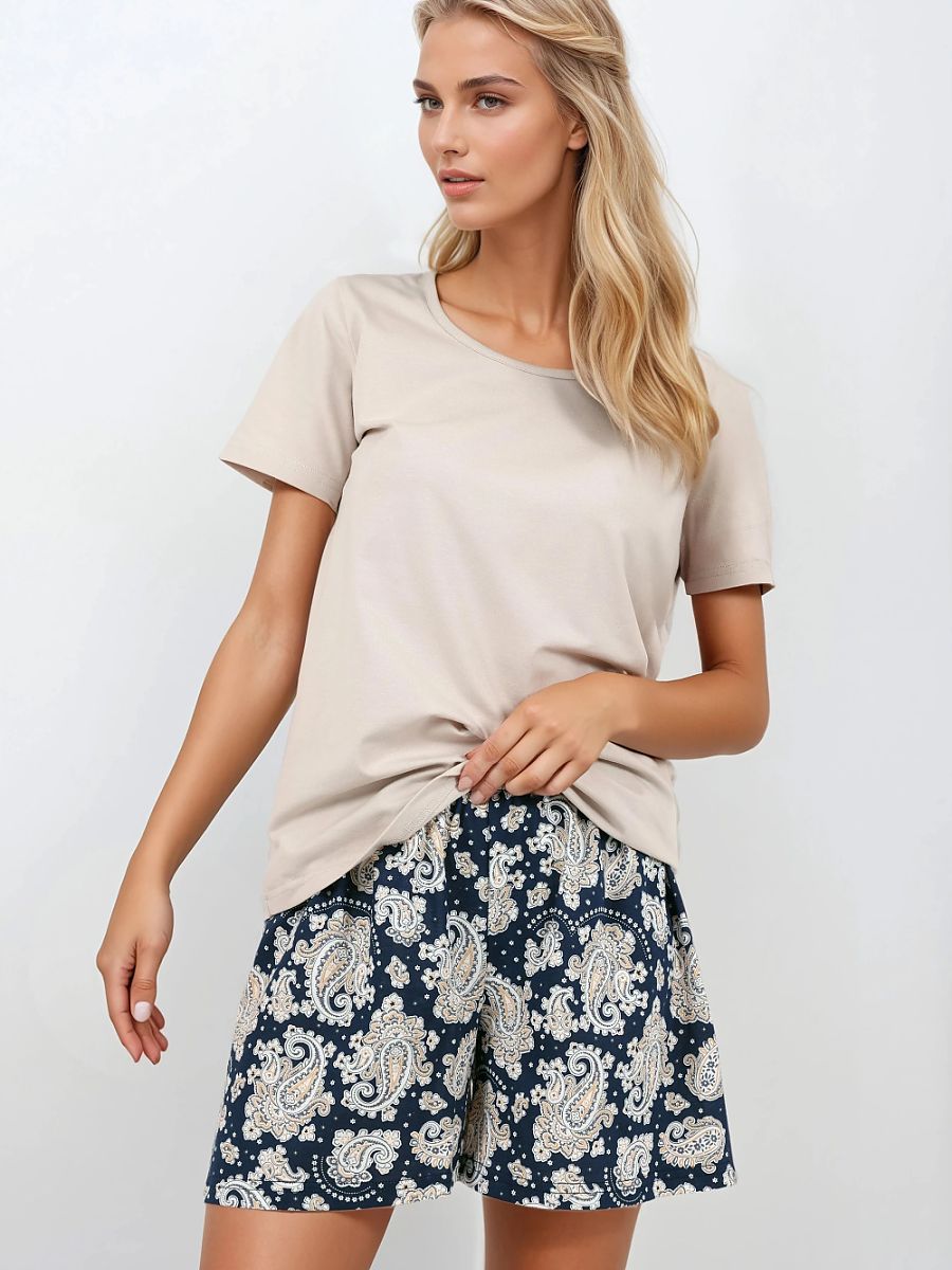 Mujer's pajamas con el OEKO-TEX Standard 100 certificate, hecho de natural, hypoallergenic materials ese provide comodidad y safety para sensitive piel. El 2-piece conjunto consists de un loose top con un round escote y short sleeves, y stylish shorts con un moderno estampado y un elastic waistband para un perfecto ajuste. El femenino style y elegante diseño make el pajamas perfectamente combinar comodidad con aesthetics. Un Polish product, designed y sewn con care para alta calidad de estampado y details.