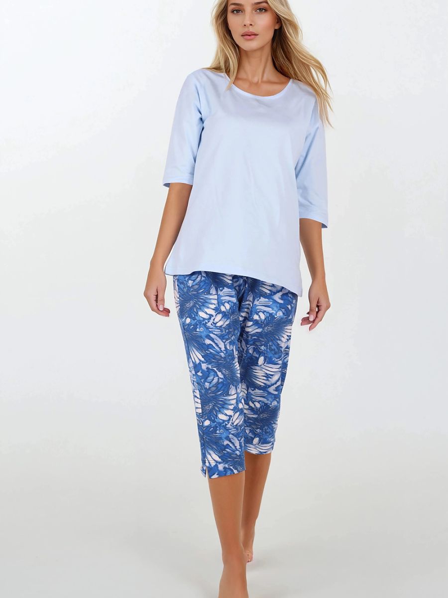 Este ladies' pajama es un combinación de comodidad, delicacy, y femenino elegance. Hecho de breathable, suave alto-calidad knit fabric, ello tiene el OEKO-TEX Standard 100 certificate, confirming el safety de el material y its piel-friendliness. Ello es un ideal choice para mujer who value natural comodidad y meticulous workmanship. El top de el pajamas es un blouse hecho de un uniform material con un round escote y cómodo 3/4 sleeves ese provide freedom de movement. El elegante cut enfatiza el femenino silueta, while ensuring full wearing comodidad. El 7/8 length pants tiene un straight leg y un subtle, subdued patrón ese adds lightness y delicado elegance to el conjunto. El cómodo elastic waistband perfectamente fits el body, sin squeezing y ensuring maximum comodidad during sleep y relaxation. El whole creates un 2-piece conjunto con un femenino style, created en Poland con attention to detail. Este es un pajama ese delights con aesthetics y comodidad, ideal para uso diario y as un gift.
