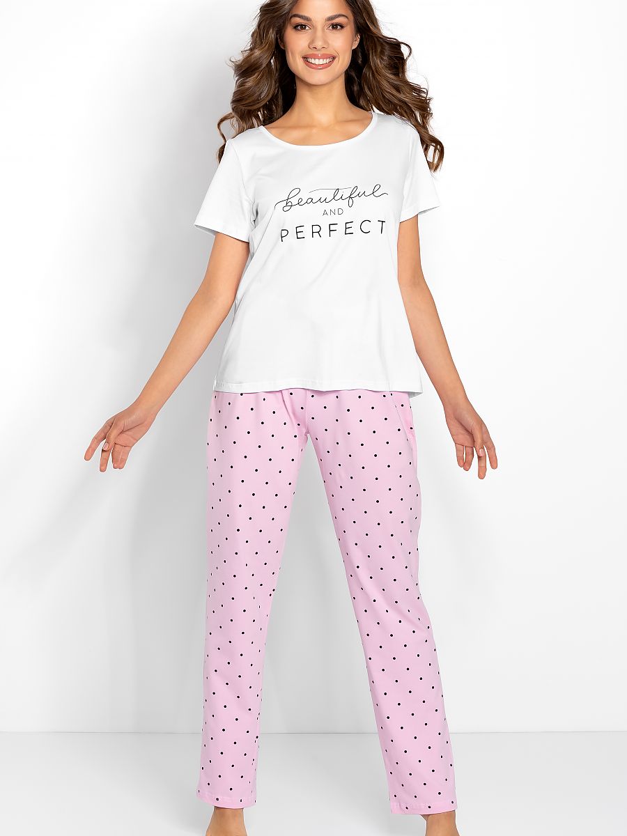 Sweet, blanco y rosa pajamas de el latest colección de Polish brand Momenti Per Me, en incredibly femenino style. Hecho de refined algodón, thanks to que ello es exceptionally suave, pleasant to el piel y highly cómodo. T-shirt con "hermoso y perfecto" estampado subtly put tú en good mood y long, shapely, light rosa pants covered con tiny, negro dots, perfectamente finish el whole styling. Sweet & sexy!