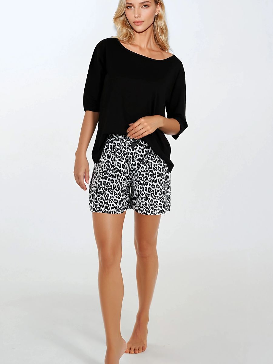 Mujer's two-piece pajama conjunto con un regular cut, hecho de delicado y breathable viscose. El top con un round escote y 3/4 sleeves tiene un loose, cómodo ajuste, perfecto para loungewear as well. El conjunto includes shorts con un estampado, equipped con un elastic waistband para un cómodo ajuste. El conjunto stands out para its alta calidad, designed y sewn en Poland.