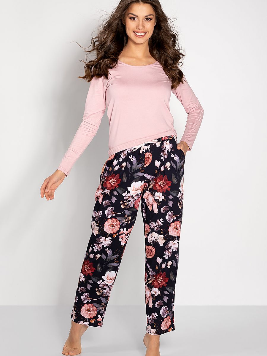 Blouse con long sleeves y un U-shaped escote. Long pants con elastic waistband y slip pockets.