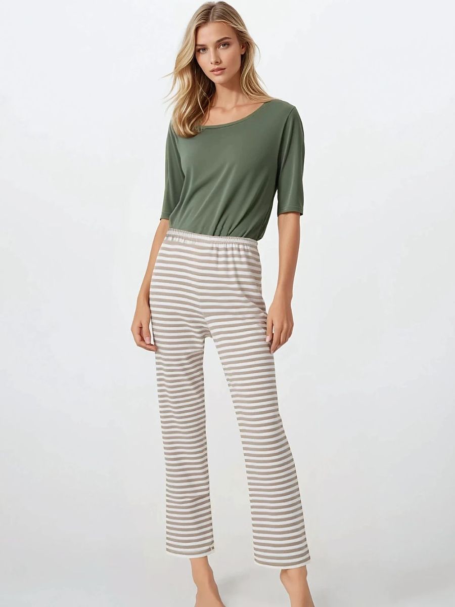 Two-piece pajamas con un elegante style, created con comodidad y un femenino look en mind. El round escote y 3/4 sleeves add subtle charm, while el loose, cómodo ajuste provides full freedom de movement. El straight leg y wider trouser leg create un harmonious whole, que es no solo cómodo, but también elegante. El pajamas son hecho de natural materials guaranteeing alta calidad y hypoallergenic properties, making them ideal incluso para sensitive piel. El elastic waistband ensures ese el modelo fits perfectamente to el silueta, proporcionando comodidad throughout el night. Designed y made en Poland, el pajamas son un excellent choice para homewear y as un gift.
