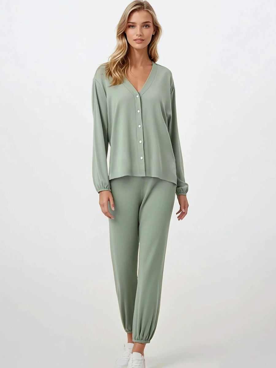 Elegante mujer's pajamas con un femenino y cómodo cut, perfecto para ambos sleep y stylish homewear. El 2-piece conjunto consists de un button-up shirt con long sleeves, un V-escote, y un subtle, delicado color scheme. El sleeves son finished con un suave cuff para comodidad y practicality, especially en cooler days. El long pants con un wider leg y elastic waistband ensure freedom de movement y un perfecto ajuste. Hecho de delicado, breathable viscose, el pajamas son piel-friendly y también work well para mujer con un larger busto. Designed y made en Poland, un great choice para un gift o as diario, stylish ropa de noche.