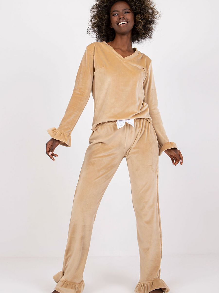 Velour pajamas consisting de un blouse y pants. Blouse con long sleeves trimmed con frills y un sweetheart escote.