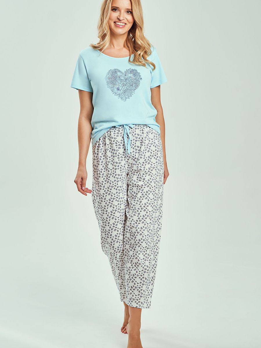 Mujer's pajamas hecho de suave y pleasant to el touch algodón son un ideal proposition para mujer who appreciate comodidad y subtle style. El short-sleeved shirt con un round escote ensures cómodo llevar, y el light color scheme es enriched con un delicado heart estampado en el front de el blouse, unñadiendo charm to el whole. El patterned 7/8 length pants perfectamente complementa el top, y el elastic waistband, forrado con algodón y complemented by un tied cinta, guarantees un perfecto ajuste. El pajamas son packed en un practical plastic bag y son great para ambos sleep y home relaxation.