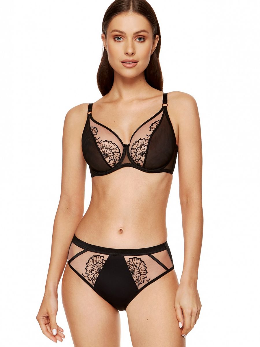 Elegante sujetador en negro y beige color scheme. Transparente, pulled up, suave cups hecho de double malla y bordado. Espalda hecho de reinforced elastic tul. Dorado details add un touch de elegance. Vertical side whalebones stabilize el sujetador's circumference. El sujetador was designed y sewn en Poland.