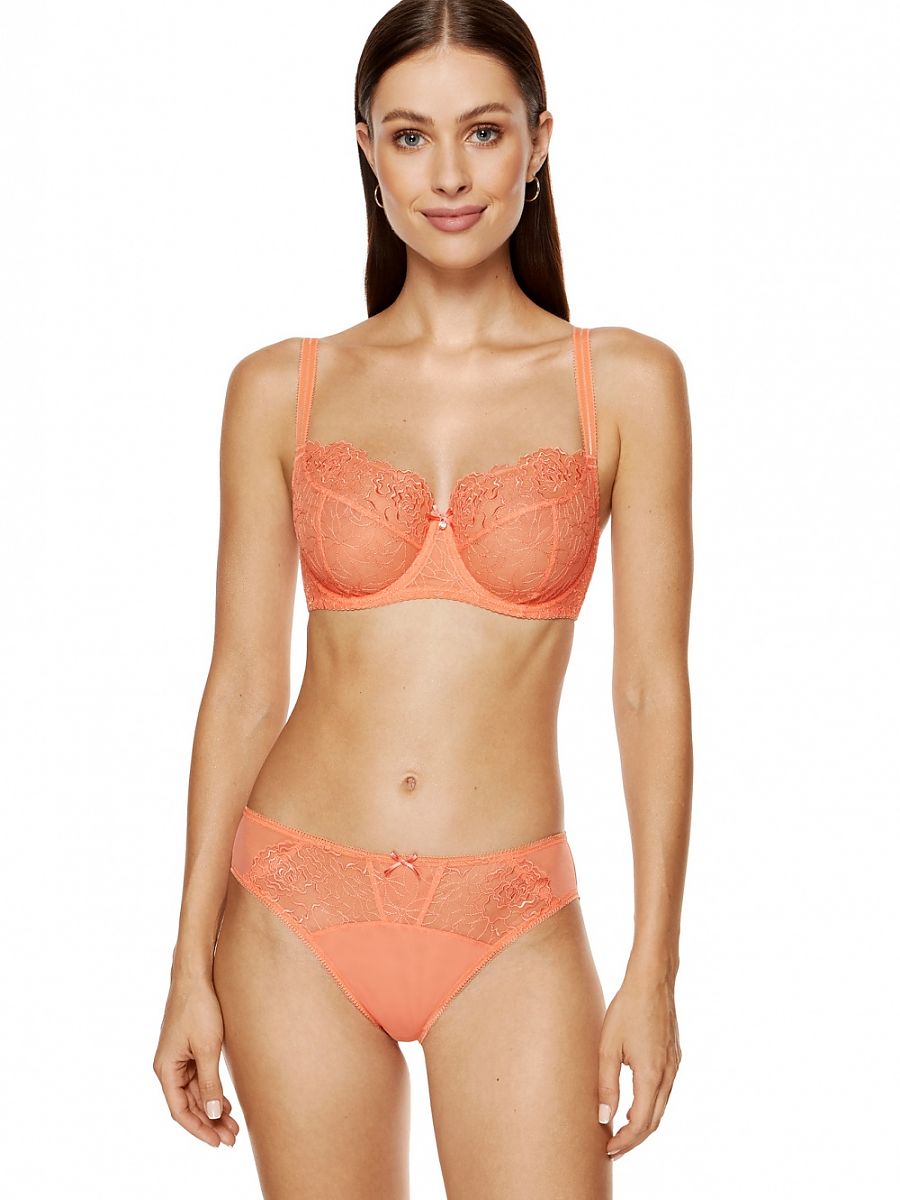 Introducing un suave sujetador en peach color. Suave balconette cut cups hecho de semi-transparente bordado con un subtle floral patrón. Part de el cups reinforced en el inside con elastic tul. Entre el cups ahí es un glittering decoration y un lazo. El sujetador was designed y sewn en Poland.